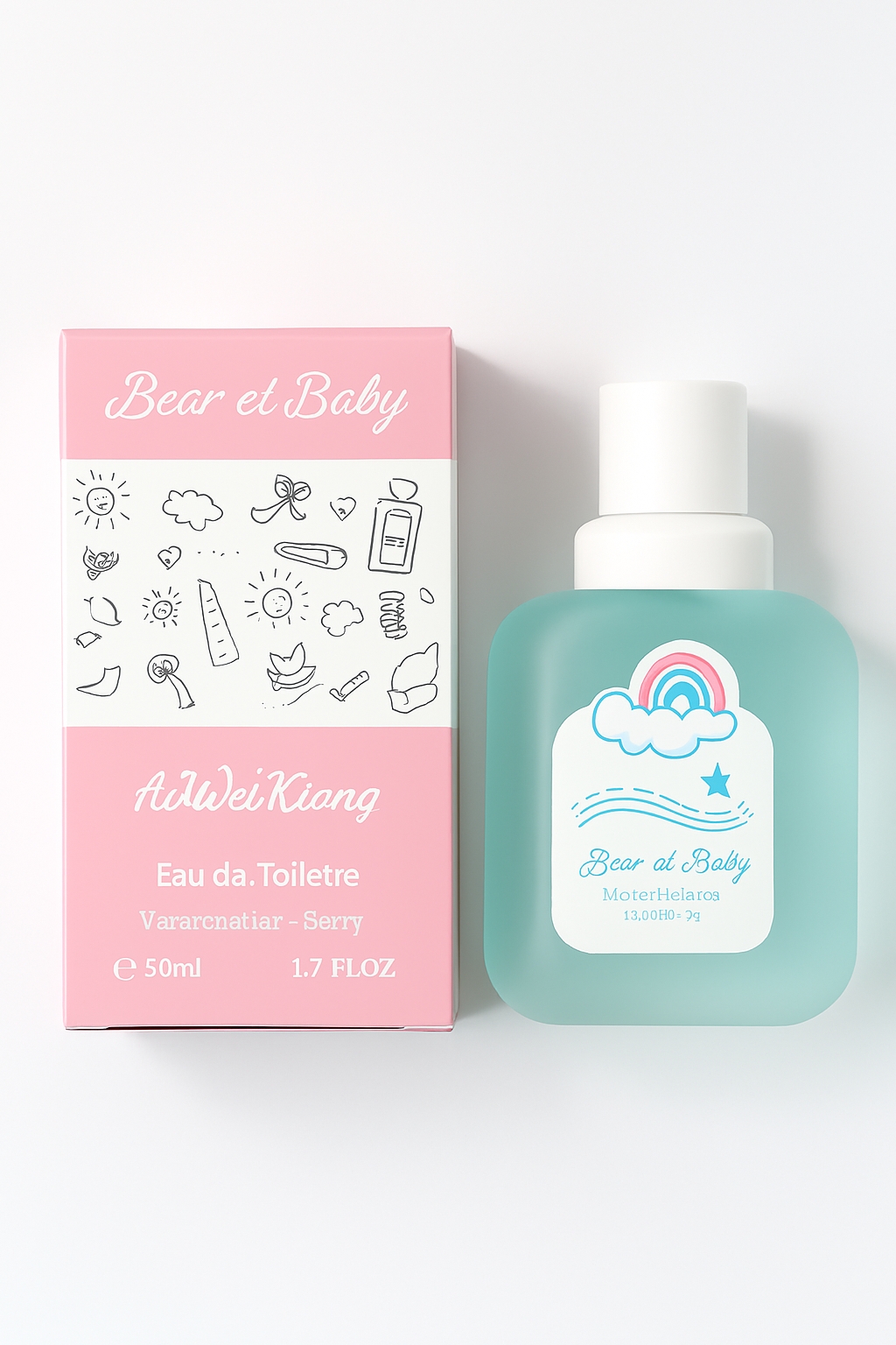 - طراحی بصری جذاب: بطری آبی یخی با لیبل رنگینکمانی و جعبه صورتی با نقوش کودکانه، حس لطافت و شادی را منتقل میکند. این طراحی برای هدیه دادن یا استفاده در سیسمونی بسیار دلپذیر است.